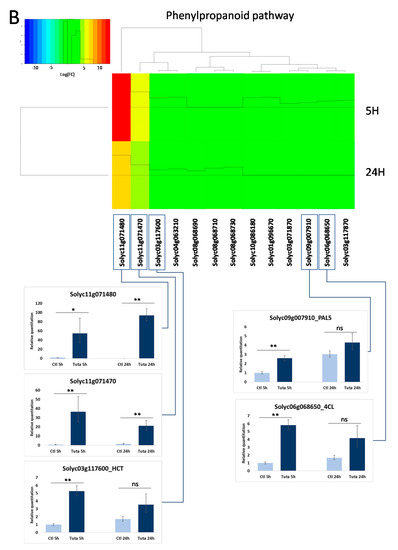 Expression level of selected genes representing key steps in the polyamine (A) and phenylpropanoid (B) pathways. The heatmap represents the differential expression measured from the RNAseq analysis, between control and T. absoluta infested leaf at 5 h and 24 h. In addition, the expression level of several genes was measured by real-time PCR on cDNA prepared from leaves corresponding to the 4 conditions (control and T. absoluta infested after 5 h and 24 h). Statistical significance is indicated by * (p < 0.05), ** (p < 0.01) and *** (p < 0.001). ns means non significant.