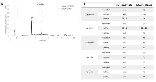 Functional identification of Solyc11g071470 and Solyc11g071480 as putrescine hydroxycinnamoyl-CoA transferase. (A) Chromatogram of biochemical assays realized on the purified enzymes; (B) table showing the substrate preference measured from the consumption of the acyl-CoA substrate and normalized to the best reaction. CP, caffeoyl putrescine; coum-CoA, p-coumaroyl-CoA; Caf-CoA, caffeoyl-CoA; Fer-CoA, feruloyl-CoA; nd, no activity detected.