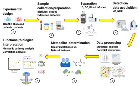 Metabolomics is the newest omic science in systems biology, following genomics, transcriptomics, and proteomics. The four omics are complementary in understanding the interrelated cellular functions of a specific disease phenotype [1]. Metabolomics is currently applied to various disciplines including environmental epidemiology, food technology, ecological restoration, and oncology. It is an analytical profiling technique that measures and compares large numbers of metabolites in a biological sample. Metabolomic analysis is performed to identify (untargeted, global, and top-down approach) and quantify (targeted, specific, and bottom-up approach) metabolites with the goal of understanding the mechanisms by which upstream molecules (genes, RNAs, and proteins) contribute to pathology [2,3,4]. It seeks to investigate how therapeutics affect treatment outcomes [5] by serving as biomarkers via the quantification of these small molecules [6,7]. Metabolites (≤1.5 kD), which include sugars, fatty acids, amino acids, nucleotides, alkaloids, and steroids [1,8] can sometimes be enzymatically transformed into epimetabolites, allowing them to regulate physiological processes [9,10,11]. Because biological matrices are complex with thousands of metabolites in them, the use of analytical methods such as metabolomics allows individual metabolite measurements to be managed [12,13,14,15,16,17,18]. The difference between the two types of metabolomics is that the untargeted approach identifies a single metabolite in a hypothesis-driven manner, while the targeted approach quantifies a metabolite of interest a priori [1,2,19]. In humans, the untargeted approach reveals functional changes to the metabolome as a result of endogenous (diet, exercise) and exogenous (environmental exposures, virus, and genotoxins) agents [20,21,22,23]. Because the untargeted approach deals with a vast number of unknown molecules with disparate physical and chemical characteristics, multiple protocols for sample preparation, data acquisition, and analysis are required including subsequent validation via the targeted approach [24]. Regardless, in both approaches, tools such as high-performance liquid chromatography (HPLC), mass spectrometry (MS), and nuclear magnetic resonance (NMR) are used to provide insights into the disease mechanisms [3,4,18,25]. For clarity, metabolism refers to the series of biochemical processes that generate energy via ATP, while the metabolome is the collection of metabolites that are produced by cells during metabolism. The number of metabolites (intermediates) in a metabolome depends on the biochemical pathway involved. Moreover, metabolomic and metabolic are distinct from each other in that the former refers to the actual omic approach while the latter is a term that signifies the relationship to metabolism. The process flow for LC-, MS-, and NMR-based metabolomic analysis for disease biomarker research is shown in Figure 1.