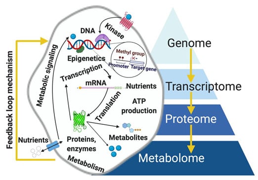 Hierarchical dimension of the omics reflecting metabolome in the most downstream position, directly linking genotype to the phenotype of a diseased cell. Results of metabolomics serve as inputs for further genomic analysis (i.e., feedback loop mechanism). Figure drawn using BioRender [26].