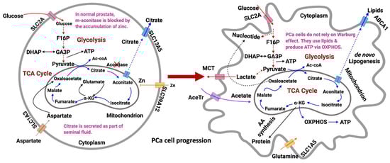 The PCa metabolome contains metabolites that reflect the human body’s reaction to tumor progression. Differentiating the PCa metabolome from the general human metabolome is critical since the complex relationships among these metabolites and how they affect PCa development is still a fairly new research area. As previously mentioned, alterations in genome, transcriptome (blueprints), and proteome (execution) do not directly reflect phenotypic changes. However, accurate identification and measurement of relevant metabolites provide functional PCa information because they are the end products of complex biochemical reactions, which can sensitively monitor any internal and external DNA damaging agents, including environmental factors [105,106]. The number of human PCa metabolites currently being researched is still very low but these few metabolites are highly specific pertinent pathways [107]. PCa metabolites can be conveniently extracted from urine, plasma, blood, and tissue. Traditional human clinical metabolic studies on PCa rely on biofluids because they are convenient and non-invasive to extract. However, researchers and clinicians are moving toward extracting tissues since they are organ specific, which reflects localized biochemical perturbations [108]. Challenges associated with tissue metabolomics, however, involve invasiveness, low patient samples for robust biomarker discovery and validation, and non-standardized protocols for various types of tissues. In terms of the separation of hydrophilic and lipophilic metabolites, whether they are extracted from biofluids or tissue, one challenge is separation and resolution efficiency. Each sample matrix is different, based on source and individual. Thus, equipment in the metabolomic analysis must be optimized, calibrated, and re-optimized to ensure clear separation of the metabolite of interest. Moreover, different mixed solvent standards must be used either as single, combined, or biphasic solvents to ensure increased levels of detection for all biofluid, tissue, and cell line samples. Healthy prostate cells rely on glucose oxidation for ATP production, and they are characterized by low citrate metabolism within the TCA cycle resulting in citrate accumulation [109,110]. Malignant transformation of prostate cells, however, activates the TCA cycle by decreasing zinc levels and the cells rely heavily on lipids for energy [111]. Unlike other cancers, PCa cells are unique in that they are not glucose dependent (non-Warburg). These cells show higher levels of metabolites including choline and sarcosine and lower levels of polyamines and citrate compared to normal prostate epithelial cells [111].
