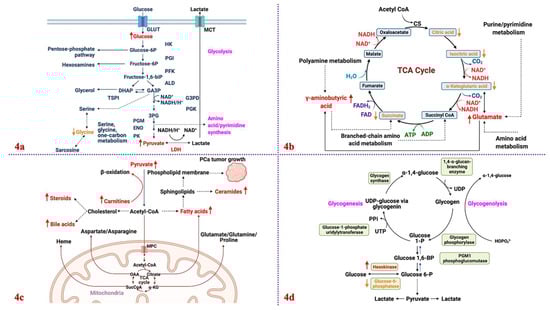 | Chen et al., 2020 [148] | EMT-PCa and epithelial PCa differentiation | ARCaPE ARCaPM | LC-MS Glucose uptake assay | Aspartate (+) Glycolytic enzymes (+) except for glucose 2 transporter (−) TCA cycle: pyruvate dehydrogenase kinase 1/2, pyruvate dehydrogenase 2 (+) Succinate dehydrogenase A, aconitase 2 (−) Glutaminase 1/2 (+) | Glucose uptake Aspartate metabolism Glycolysis TCA cycle Glutamine–glutamate conversion | PCa cells undergoing epithelial-mesenchymal transition (EMT) showed low glucose consumption. Glucose metabolism in ARCaPE downregulated. Glucose metabolism in transcription factor- (TF) induced EMT models downregulated. ARCaPM cells showed increased aspartate metabolism. |