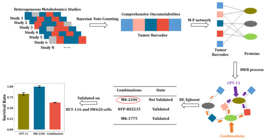 Therefore, we propose an integrated vote-counting and Bayesian frame strategy (called the Bayesian vote-counting method) to combine existing metabolomics studies and establish tumor barcodes, as a proof of concept, for colorectal cancer (CRC). A comprehensive network consisting of the oncometabolites in the barcode, as well as interactive enzymes, translators, or other proteins obtained from open-source databases such as Stitch [16] and String [17], was constructed. This network can be regarded as a space to span the information on these interactions. The effect of anticancer drugs or drug combinations was mapped into this space by the random walk with restart method [18]. It is known that Irinotecan (CPT-11) is a first-line anticancer drug in clinical for the treatment of CRC with an unsatisfactory effective rate of <50% [19]. In the present study, utilizing the established tumor barcodes, constructed network, as well as the Drugs Combination Database (DCDB) [20], drugs/compounds that can sensitize CPT-11 were discovered. In the end, a compound named MK2206 was highlighted, and its synergy with CPT-11 was validated on two CRC cell lines, indicating that the concept of utilizing metabolic information for the discovery of anticancer drug combinations has a great potential. Compared to experimental screening methods, this strategy is much more time and cost effective. More importantly, the established workflow can be readily applied to other cancer types or diseases.