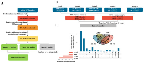 The obtained literature received a closer check on title and abstract. The duplicated and irrelevant ones were not included. Review articles or original articles without metabolite annotations were also removed. Further, articles that only report the significantly changed metabolites without mentioning the changing trends were also removed. All the reserved studies were used to generate a data set and labeled by sample types (i.e., serum, cancer tissue, or feces). Information including methodological parameters (sample type, instrument, method, etc.) and reported metabolites (concentration, fold-change, up- or downregulation, etc.) were then extracted.