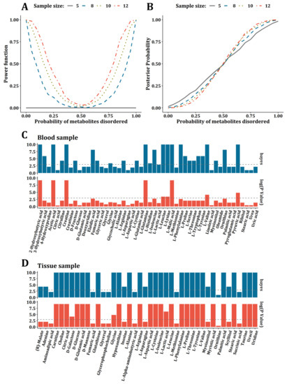 To compare the performance of the Bayesian frame and sign test, we conducted a simulation test. As a result, the statistic power of the sign test was improved as a sample size increasing under identity disorder probability; however, while the sample size was less than 8, the statistic power was too low and no significant oncometabolites could be detected while the sample size was <5 (Figure 3A). Due to the frequency of oncometabolites being mostly <8 in the dataset that we collected, the sign test in the vote-counting method was underpowered for the data integration. In the case of the Bayesian frame, it was found that the expectation of posterior probability of oncometabolite disorders was close to the real probability used to generate simulated samples. Further, the fitness between the expectation of posterior probability and real disorder probability was robust even when the sample size was equal to 5 (Figure 3B). Therefore, we concluded that the Bayesian frame was more suitable for integrating metabolomics studies than the sign test. On the other hand, with the criteria of the absolute Bayesian factor >3 or p-value < 0.05 in the sign test, 27 oncometabolites were detected by the Bayesian method, while only 9 by sign test from blood samples (Figure 3C). In tissue samples, it was 34 (Bayesian) vs. 28 (sign test) (Figure 3D).