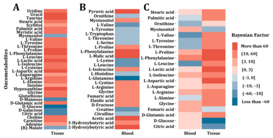 We then constructed the barcodes with significantly altered oncometabolites (the absolute Bayesian Factor >3). Among the 43 oncometabolites found in tissue, 28 significantly upregulated (Bayesian Factor >3) and 6 downregulated (Bayesian Factor <−3) were used (Figure 4A). In the 50 blood oncometabolites, 15 upregulated (Bayesian Factor >3) and 12 downregulated (Bayesian Factor <−3) were included (Figure 4B). Moreover, 21 oncometabolites were found significantly altered in blood or tissue (Figure 4C). The colors in Figure 4A,B are deeper because the absolute Bayesian factors are all larger than 3. Figure 4C represents a tumor barcode consisting of common oncometabolites appearing in both blood and tissue (Frequency >3) with significant alteration in at least one type of sample rather than both. In other words, not all the absolute Bayesian factors are larger than 3 in Figure 4C. Thus, the colors in Figure 4C seem to be lighter than those in Figure 4A,B.