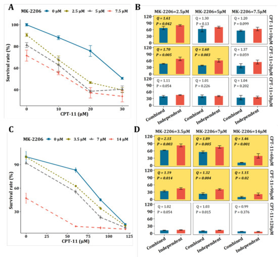The IC50 of CPT-11 was determined on HCT-116 and SW-620, respectively (Figure S5) and the concentrations of CPT-11 were set accordingly. Figure 5A,B show the results from HCT116 cells. As shown in Figure 5A, the effect of CPT-11 or MK-2206 was both dose-dependent. More importantly, MK-2206 increased the sensitivity of CPT-11 at all designed concentration levels. We calculated the combination index Q as well as the p-value of the Bliss independence model and the results are shown in Figure 5B. Significant synergism between CPT-11 and MK-2206 was observed on HCT-116 cells when (1) MK-2206 = 2.5 μM, CPT-11 = 10 μM; (2) MK-2206 = 2.5 μM, CPT-11 = 20 μM; and (3) MK-2206 = 5 μM, CPT-11 = 20 μM. Likewise, this synergistic effect was validated on another CRC cell line, i.e., SW620. As we can see from Figure 5C, the effect of CPT-11 or MK-2206 on SW620 cells was also dose-dependent and MK-2206 increased the sensitivity of SW-620 to CPT-11 at all designed concentration levels. Significant synergism between CPT-11 and MK-2206 can be seen on SW-620 cells when (1) MK-2206 = 3.5 μM, CPT-11 = 60 μM; (2) MK-2206 = 3.5 μM, CPT-11 = 90 μM; (3) MK-2206 = 3.5 μM, CPT-11 = 120 μM; (4) MK-2206 = 7 μM, CPT-11 = 60 μM; (5) MK-2206 = 7 μM, CPT-11 = 90 μM; and (6) MK-2206 = 7 μM, CPT-11 = 120 μM (Figure 5D).