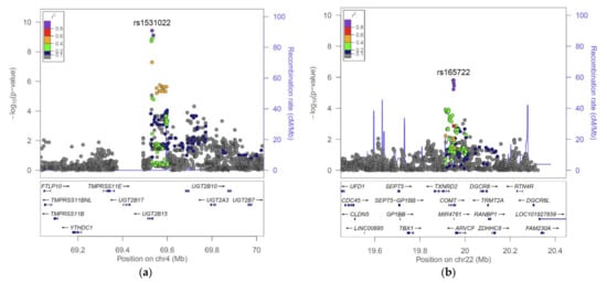 Regional association plots for the UGT2B15 (a) and the COMT (b) loci with the ratios 2-methoxyacetaminophen glucuronide*/2-methoxyacetaminophen sulfate* and 2-methoxyacetaminophen sulfate*/2-hydroxyacetaminophen sulfate*, respectively.