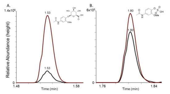 Co-elution of 3-methoxyacetaminophen metabolites (red) with peaks detected in human EDTA plasma (black). (A) Extracted Ion Chromatogram (XIC) of m/z 356.0987 +/− 5 ppm in negative ion mode for 3-methoxyacetaminophen glucuronide (red) and human EDTA plasma (black); and (B) XIC of m/z 260.02343 +/− 5 ppm in negative ion mode for 3-methoxyacetaminophen sulfate (red) and human EDTA plasma (black).