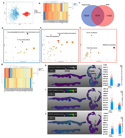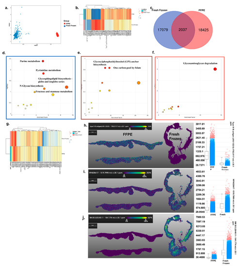 MALDI positive mode imaging of skin tissue: (a) Nonmetric dimensional plot of the metabolites present in fresh frozen and FFPE samples. An ANOSIM test showed that there are significant differences in the metabolic profiles of the groups tested. (Stress: 0.03219174, ANOSIM statistic R: 1, significance: 1 × 10−4). (b) Heatmap plot of the top 50 most significantly different metabolites between the two groups. (c) Venn diagram showing the unique and shared metabolites from the two groups. (d–f) Metabolic pathway analysis plot created using MetaboAnalyst 5.0, USA. Plots depict several metabolic pathways that differ between the fresh frozen and FFPE samples tested. (d) Differential metabolites calculated from FFPE vs. fresh frozen samples. (e) Common metabolites from the FFPE and fresh frozen groups were sorted based on p-values (high to low). (f) Differential metabolites were calculated from fresh frozen vs. FFPE. (Box color corresponds to the same color from the Venn diagram). The y-axis is the log scale of the p-value; pathways that were most significantly different are characterized by high –log10(p) values. (g) The top 50 common metabolites were sorted based on p-value and are represented as a heatmap with their detected intensities. (h–j) Specific metabolite distribution images are presented along with an intensity box plot. (h) An image of type IV B antigen distribution in both tissues and an intensity box plot of the same metabolite’s distribution. (i) An image of NPA028417 distribution in both tissues and an intensity box plot of the same metabolite’s distribution. (j) An image of SM 20:3: 20/40 distribution in both tissues and an intensity box plot of the same metabolite’s distribution.