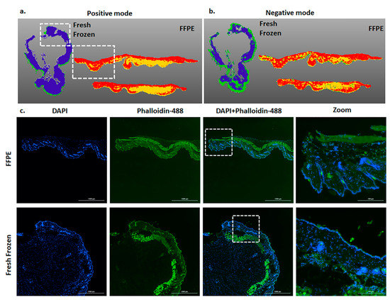 Segmentation and Immunohistochemistry of skin tissue post-MALDI Imaging: (a,b) Representative images show the differential presence of metabolites from the skin tissue in FFPE and fresh frozen conditions in positive and negative mode MALDI imaging, respectively. (White dotted box represents the tissue area imaged in ©). (c) Representative immunohistochemistry images show the FFPE and fresh frozen tissue sections stained with Phalloidin-488 (green staining actin) and DAPI (blue staining nucleus) stains. The white dotted box shows the zoomed image.
