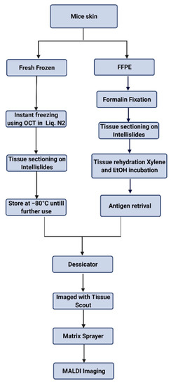 After collecting the mouse skin, tissue samples were immediately placed in a formalin solution for 72 h at room temperature. Samples were then transferred to a 70% ethanol solution and embedded in paraffin; tissue was sectioned to a thickness of 10 µm and placed on Intellislides (#1868957 Bruker Scientific LLC, Billerica, MA, USA). To rehydrate the tissue section, slides were incubated in different concentrations of dehydrant as follows: twice in Xylene (# 23044192 Fisher Scientific Waltham, MA, USA) for 10 min each, and then in 100% ethanol twice for 10 min each, 95% ethanol for 5 min, 70% ethanol for 5 min, and 50% ethanol for 5 min. Tissue sections were rinsed in water and placed in 1× PBS for 10 min. For antigen retrieval, tissue slides were placed in an instant pot under high pressure for 40 min in PH = 6 epitope retrieval solution (# RE 7113 Leica Biosystems, IL, USA). Tissue slides were then rinsed in distilled water and placed in PBS (#10010023 Thermo Fisher Scientific, Waltham, MA, USA). Then slides were placed in a desiccator and imaged with Tissue Scout (Bruker) before proceeding to the matrix sprayer. Schematic representation of all the steps has been shown in Figure 4.