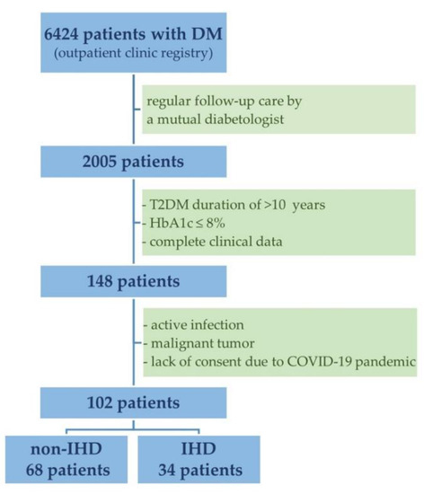 A database providing information on diabetics attending the Diabetes Outpatient Clinic in Lodz (Poland) between 2019 and 2021 was used for this study. The registry enrolled 6424 patients with DM, of whom 102 met the following inclusion criteria for the present research: (1) age > 18 years; (2) T2DM duration of >10 years; (3) regular follow-up care by a mutual diabetologist; and (4) HbA1c ≤ 8%. Individuals with any of the following conditions were excluded: (1) active infection; (2) malignant tumor; or (3) missing key clinical data. Participants were assigned to one of two groups based on the occurrence of IHD: Group 1 (non-IHD, n = 68) or Group 2 (IHD, n = 34).