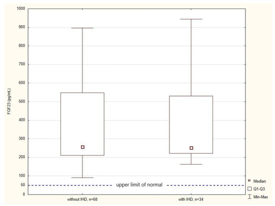 Box plots showing the median levels of FGF23 according to IHD status with reference to the upper limit of normal for FGF23 according to Yamazaki et al. [15]. Abbreviations: IHD, ischemic heart disease; FGF23, fibroblast growth factor 23.