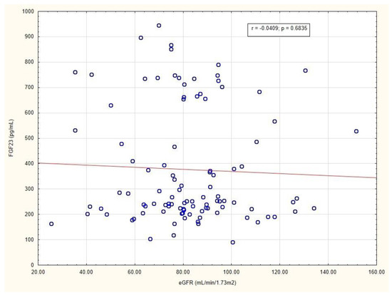 A lipid profile consisted of the following tests: total cholesterol (TC) (152.0 mg/dL, IQR 125.0–186.0), high-density lipoprotein cholesterol (HDL-C) (49.0 mg/dL, IQR 42.0–59.0), low-density lipoprotein cholesterol (LDL-C) (72.0 mg/dL, IQR 51.0–98.0), non-high-density lipoprotein cholesterol (non-HDL-C) (96.0 mg/dL, IQR 75.0–126.0), and triglycerides (TG) (126.0 mg/dL, IQR 94.0–169.0). None of the laboratory variables correlated with FGF23 levels. Patients in Group 2 had a significantly higher level of Cr (p = 0.002) and a lower concentration of HDL-C (p = 0.029).