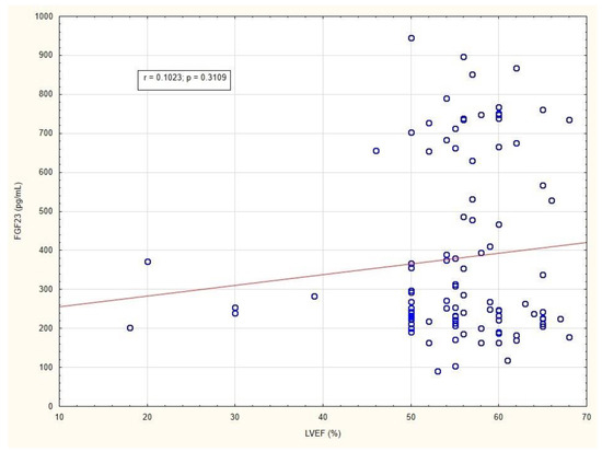 All patients underwent full transthoracic echocardiography. The median left ventricular ejection fraction (LVEF) was 56% (IQR 52–60). No correlation was found between LVEF and FGF23 levels in patients (Figure 5).