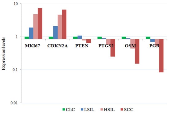 Boon J.A et al. revealed the relationship between the severity of neoplasia and the level of CDKN2A, ESR, and PGR mRNA expression []. As the severity increased, CDKN2A expression increased and ESR and PGR expression decreased. Our results are consistent with the data of the Boon J.A et al. study for the CDKN2A and PGR genes.