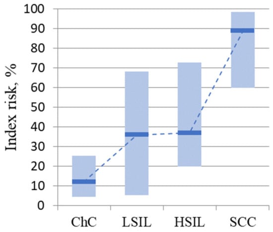 An integral assessment of the expression profile of MKI67, PGR, CDKN2A, and BCL2 identified 45 patients (41%) at risk for developing cervical cancer: 14 (47%) from the LSIL group, 9 (30%) from the HSIL group, 22 (73%) patients from the cervical cancer group, and none of the patients from the group with cervicitis. At the same time, there was a statistically significant increase in the median risk index in the LSIL (p = 0.024), HSIL (p = 0.024), and cervical cancer (p = 8.8 × 10−6) groups compared with the cervicitis group (Figure 2).