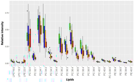 The lipids were annotated with in-lab created R code (the RStudio version was 1.1.463 and the R language version was 3.5.2), which compares measured accurate m/z values with theoretical computer-generated values. The code searched a record within 10 ppm from the experimental m/z. Proton and sodium ion adducts were considered. More precise identification was done based on the MS/MS data for the peak under consideration, if it had undergone MS/MS analysis. Lipids nomenclature through the paper is in accordance with LIPID MAPS [] terminology and shorthand notation summarized in []. Annotated lipids were used for further statistical analysis.