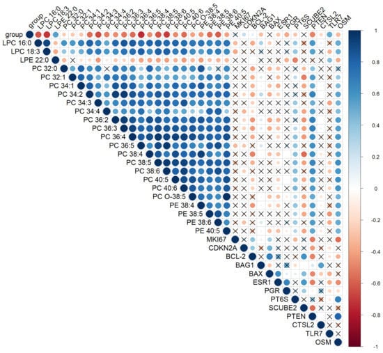 Spearman’s correlation analysis of the cervical tissues’ lipid profile in CINs and SCC, histological diagnosis, and gene mRNA expression levels at a confidence level of 0.05. Positive correlation is highlighted in blue and negative correlation in red. The degree of correlation is highlighted in color—the stronger the correlation, the darker the color. “X”—correlations with p-value > 0.05. Parameter group shows the degree of cervical epithelium transformation: 0-ChC, 1-LSIL, 2-HSIL, and 3-CC.