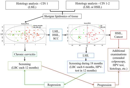 As a result, an algorithm was developed for the management of patients with HPV-associated diseases of the cervix, based on the panel of 23 lipids. Lipidomic analysis of the affected cervical tissue by ESI-MS, along with HPV-typing and histological examination, can be of great practical importance for early, differential, accurate, and rapid diagnosis of the severity of cervical epithelium dysplasia. The results of the work will contribute to the early detection of HSIL and cervical cancer, a more accurate diagnosis (LSIL vs. HSIL), as well as a decrease in the unnecessary use of destructive treatment techniques.