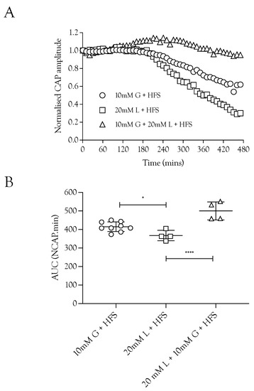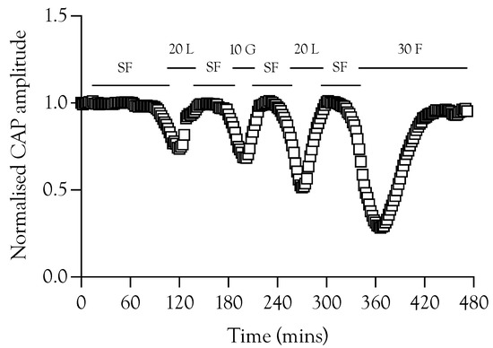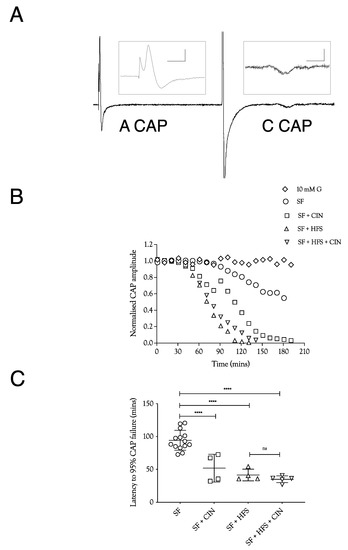 Descriptive statistics are expressed as the mean ± standard deviation, where n refers to the number of nerves [17]. The latencies to CAP failure and area of the CAP were calculated as previously described [9]. One-way ANOVA with Sidak post-tests was used to determine the significance of selected inter-group differences. All data were analysed with GraphPad Prism 7 (La Jolla, CA 92037, USA). Statistical significance in Figure 1, Figure 2, Figure 3, Figure 4, Figure 6 and Figure 7: p < 0.05 = *; p < 0.01 = **; p < 0.005 = ***; p < 0.001 = ****.
