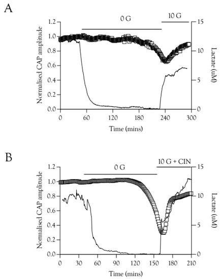 CAP recovery is preceded by elevations in extracellular lactate [lac]o. (A). Recovery of the A fibre CAP is delayed compared to recovery of [lac]o in 10 mM glucose. There is a temporal correlation between the onset of CAP recovery and the peak [lac]o level reached after introduction of 10 mM glucose, n = 3. (B). A similar effect was seen in recovery with 10 mM glucose and CIN, where the CAP recovers only after an initial rapid increase in [lac]o, n = 3.
