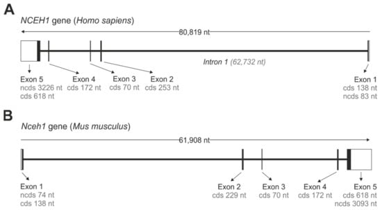 Gene organization of NCEH1/Nceh1. Gene organization of the human NCEH1 (A) and murine Nceh1 (B). Open boxes (white) represent non-coding 5′ and 3′ nucleotide sequences (ncds). Closed boxes (black) represent exons that are separated by intron stretches, represented by interconnecting lines. Lengths of non-coding and coding sequences (cds) are indicated.
