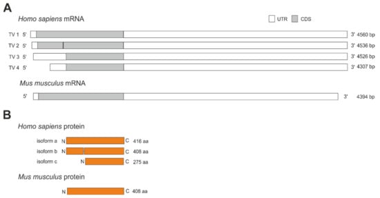 The human NCEH1 gene transcribes into four mRNA variants (Figure 2A). These variants are produced by alternative splicing and translate into three different protein isoforms (Figure 2B). Transcript variant 1 encodes for the longest isoform A consisting of 416 amino acids with a calculated molecular weight of 46,627 Da. Transcript variant 2 is generated by the usage of an alternative in-frame splice variant in the 5′ region, resulting in a shorter isoform B lacking eight amino acids from position 123 to 130, leading to a 408 amino acid protein with a calculated molecular weight of 45,808 Da. Transcript variants 3 and 4 differ in the 5′ and 3′ untranslated region and are synthesized from an alternative downstream translation start codon, leading to the same and shortest protein isoform C. Isoform C is lacking the first 141 amino acids, consisting of only 275 amino acids with a calculated molecular weight of 31,168 Da. In contrast to human NCEH1, the murine Nceh1 gene transcribes into a single mRNA that encodes for a 408 amino acid protein with a calculated molecular weight of 45,739 Da (Figure 2A,B).