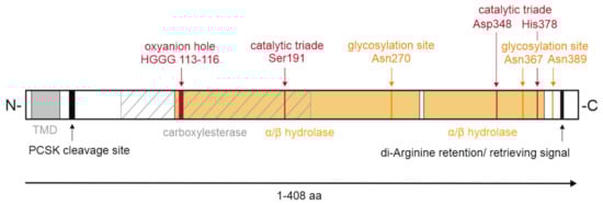 A Western blot analysis of murine KIAA1363 resulted in a double band at around 45 and 50 kDa [9,12]. Both bands have been shown to be a product of heterogenous glycosylation of KIAA1363. Treatment of HEK293 cells expressing murine KIAA1363 with the N-glycosylation inhibitor tunicamycin, as well as endoglycosidase digestion with peptide-N-glycosidase of membrane fractions derived from murine peritoneal macrophages, converted the KIAA1363-specific double band into a single 40 kDa band. Similar results were obtained by endoglycosidase H digestion of mouse peritoneal macrophage-derived membrane fractions, indicating that glycosylations are mainly formed at the ER, since Golgi-derived glycosylations are resistant to endoglycosidase H digest [24,26]. Bioinformatic analysis by Igarashi and colleagues showed that murine KIAA1363 possesses three potential glycosylation sites: Asn270, Asn367, and Asn389. Site-directed mutagenesis of the respective glycosylation sites, exchanging asparagine by glutamine, indicated that all three glycosylation sites are required for full glycosylation.