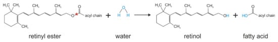 Retinyl ester hydrolysis catalyzed by KIAA1363. Red stars indicate the bond that is hydrolyzed.