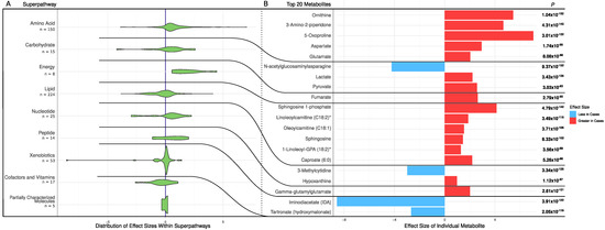 Metabolic differences between CHD patients and controls. (A) Distribution of effect sizes of metabolites grouped by super pathways. (B) Effect sizes of top 20 significantly different metabolites in cases and controls. p and effect size of the metabolites were calculated using a logistic regression adjusting for age, sex, and BMI.
