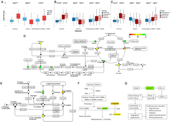 In the D-arginine and D-ornithine metabolism pathway (the second most-enriched pathway; Table 1), we observed a lower concentration of arginine in CHD (FDR p = 2.88 × 10−82) and higher concentrations of both ornithine (p = 1.04 × 10−152) and total dimethylarginine (symmetric and asymmetric, i.e., SDMA, ADMA; p = 9.14 × 10−35) (Figure 2A). L-arginine is metabolized by two competing pathways (Figure 2D–G). In the first pathway, nitric oxide synthase (NOS) converts L-arginine to nitric oxide (NO) and citrulline. This is catalyzed by endothelial nitric oxide synthase (eNOS) (EC 1.14.13.39). In the second pathway, L-arginine is the substrate of arginase (EC 3.5.3.10) that produces ornithine and urea. Within cases, the metabolite concentration of ornithine was approximately twice the concentration of arginine (ornithine-to-arginine ratio (OAR) = mean concentration of ornithine divided by mean concentration of arginine = 1.94). Within the controls, however, an opposite trend was observed (OAR = 0.89), indicating a shift in arginine metabolism for higher production of ornithine. The reduced production of NO may be attributed in part to the higher inhibitory effect of ADMA (in CHD patients) on nitric oxide synthase (Figure 2F,G).
