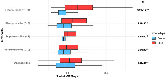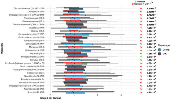 Increased acylcarnitines and decreased long-chain fatty acids in CHD: All significant acylcarnitines were elevated in the CHD patients: oleoylcarnitine (C18:1) (FDR p = 3.71 × 10−108), stearoylcarnitine (C18) (FDR p = 3.18 × 10−53), propionylcarnitine (C3) (FDR p = 3.31 × 10−44), decanoylcarnitine (10) (FDR p = 3.01 × 10−19), and deoxycarnitine (FDR p = 2.58 × 10−10) (Figure 3). The most significant long-chain fatty acids (23 out of 25) were decreased in CHD (Figure 4). This may be attributed to their conversion to acylcarnitines, which were increased in CHD.