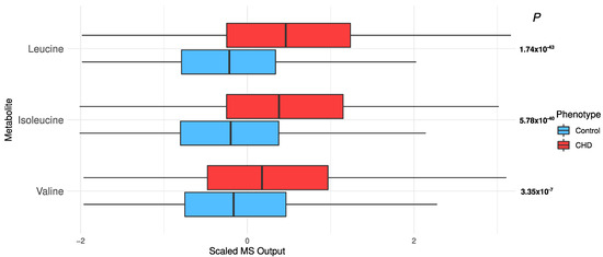 Elevated branched chain amino acids (BCAAs): BCAAs, i.e., leucine, isoleucine, and valine, were significantly elevated in the CHD patients (leucine, p = 1.74 × 10−43; isoleucine, p = 5.78 × 10−40; and valine, p = 3.35 × 10−7; Figure 5).