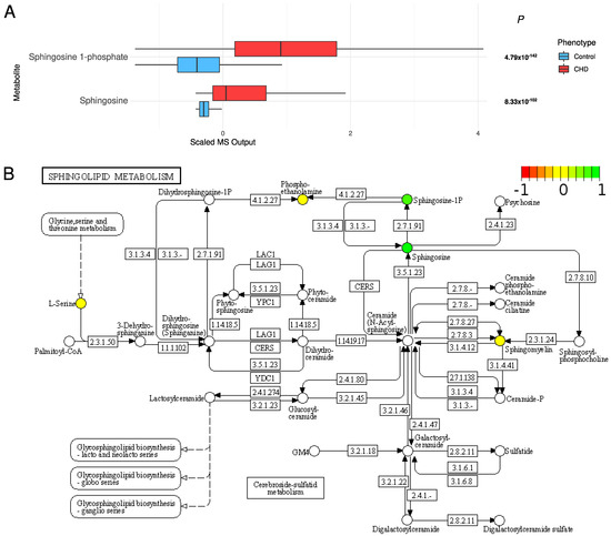 (A) The distribution of sphingolipids in the CHD patients and the controls. (B) The sphingolipid metabolism pathway (KEGG pathway: hsa00600). Colored metabolites are found in our metabolomic profile. Metabolites in red, yellow, and green have lower, the same, and higher concentrations compared with controls, respectively.