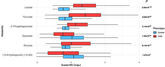 Sugar metabolism: All six “glycolysis, gluconeogenesis, and pyruvate metabolism” metabolites were significantly different, with FDR p ≤ 8.25 × 10−8 (Figure 7). Lactate (p = 3.43 × 10−135), pyruvate (p = 3.03 × 10−93), and glucose (p = 6.14 × 10−10) were higher in cases than controls (Figure 7). After adjusting for T2D, age, sex, and BMI in the univariate model, glucose and 1,5-anhydroglucitol (1,5-AG) were not significant (p = 0.35 and 0.5, respectively), but the remaining metabolites remained very significant (p ≤ 3.77 × 10−32; data not shown).