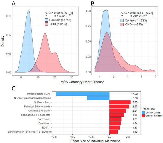 MRS discriminative performance. (A) Density plots of MRS10 in cases and controls in our test data. (B) Density plots of MRS19, which was developed by Wang et al. [13] on our test data. (C) The list of 10 metabolites used to build MRS10 using LASSO and their effect sizes. p (in (A,B)) was the p value from the logistic regression: CHD Status ~ MRS+ age + sex + BMI. AUC = area under the receiver operating curve, was calculated for the model that only contained the MRS (omitting all covariates) because of unbalance of cases and controls with respect to covariates.