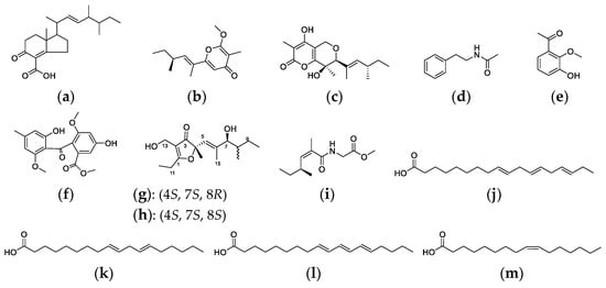 - Furumoto, T.; Hamasaki, T.; Nakajima, H. Biosynthesis of phytotoxin neovasinin and its related metabolites, neovasipyrones A and B and neovasifuranones A and B, in the phytopathogenic fungus Neocosmospora vasinfecta. J. Chem. Soc. Perkin Trans. 1999, 1, 131–135. [Google Scholar] [CrossRef]
