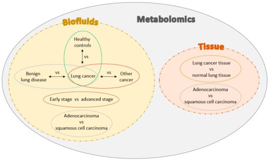 These modified biological processes give rise to alternations in metabolite concentrations in tissues and biofluids (such as plasma, urine, bronchial aspirate, etc.). More than 150 metabolites have been identified in the altered lung cancer cell metabolism. This review provides an overview of studies that classified various metabolites using plasma, serum, or tissue samples with the possibility to aid clinicians in the differentiation between (1) lung cancer patients vs. healthy controls, (2) lung cancer patients vs. other cancer patients, (3) lung cancer vs. benign lung disease, (4) early-stage vs. advanced stage lung cancer, (5) lung cancer tissue vs. normal lung tissue, and (6) different histologies of lung cancer, as graphically shown in Figure 1. Some results are consistent in different published studies regarding specific metabolites. Therefore, an overview of the main study results is summarized in Table 1. However, there is still much variability between different studies about the used techniques and patient cohorts involved. Therefore, the crucial characteristics of the studies described in this review are compared in Table 2.
