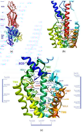 (a) GLP-1R and the G-protein (PDB:6X19). (b) GLP-1 (red alpha helix, the original ligand of GLP-1R)/GLP-1R (transmembrane region) complex (PDB:6X18). (c) Important amino acid residues in the transmembrane region (TM1-7) of GLP-1R (PDB:6X19). Ser31, Tyr205, Gln234, Arg310, Arg190, Glu364, and Leu388, shown in orange, delineate the approximate boundaries of the active site. Asn300, Lys197, Tyr148, and Tyr145, shown in red, are the residues involved in the important hydrogen bonds and π–π interaction network in the middle section. Tyr220 and Gln221, shown in green, are located on ECL1. The labeling of these important amino acids is based on the related studies of GLP-1 agonists [7,21]. The amino acids marked on the vertical axis on both sides and the horizontal axis on the bottom can be used as reference axes for analyzing the configuration of GLP-1R agonists. TM2 can also serve as a reference axis for configurational analysis of GLP-1RAs.