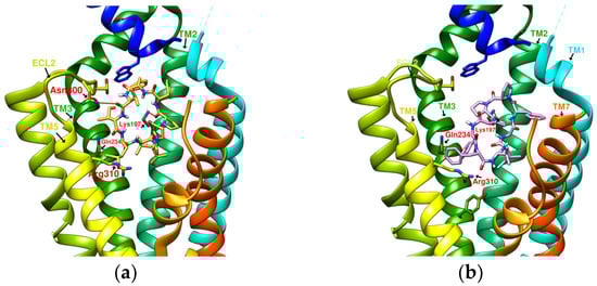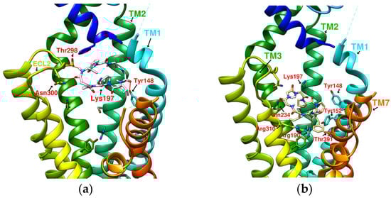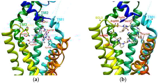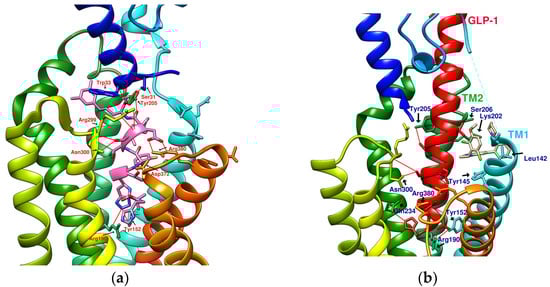 Exendin-4 is a short peptide with 39 amino acids isolated from the venom of the Gila monster. It has a 53% sequence identity with human endogenous GLP-1 and was found to have an agonistic effect on GLP-1R. Exenatide (Byetta®, Bydureon®) is a synthetic version of exendin-4 and the first hypoglycemic drug classified as a GLP-1 analog [14]. Liraglutide (Victoza®) has a 97% homology with human GLP-1. In design, liraglutide conjugates fatty acids to the original GLP-1 structure. This approach strengthens its binding to serum albumin, thereby avoiding rapid degradation by DPP4 and reducing renal clearance for prolonged action. Novel semaglutide (Ozempic®) incorporates an absorption enhancer, further realizing the possibility of oral administration [8,15]. The crystal structure of the complex of exendin-4 and GLP-1R shows that except for a part of the C-terminus, exendin-4 still adopts an α-helical conformation, and its binding site is similar to that of GLP-1 [16]. When endogenous GLP-1 penetrates the core of the receptor (PDB:6X18), it interacts with Tyr205, Arg299, Thr298, Asn300, Gln234, Try152, Arg190, etc., resulting in the outward movement of TM6, ECL3, and TM7, and the inward movement of TM1 as well as the reorganization of ECL2, as shown in Figure 1. These displacements later cause the activation of GLP-1R and trigger cAMP production [3,17].