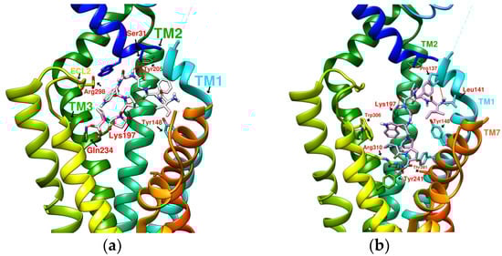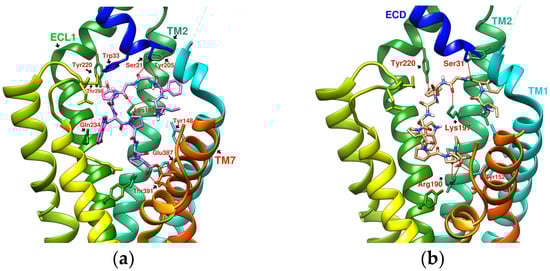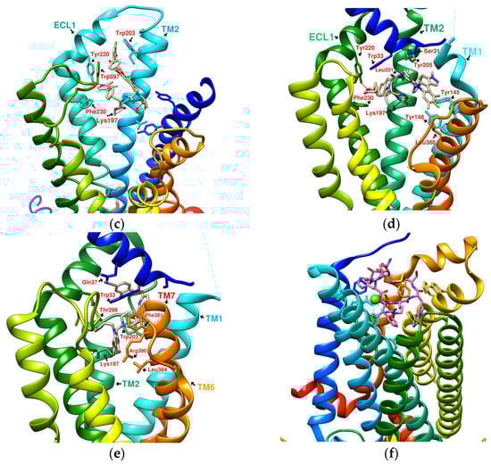 In Table 2, cyclopeptides are compared with small-molecule nonpeptidic GLP-1R agonists. Interactions of TT-OAD2, LY3502970, and PF-06882961 with GLP-1R were obtained from the literature records [17,21,24], including hydrogen bonding and hydrophobic interactions (hydrogen bonds are marked with red lines in Figure 3). Cyclopeptides have many residues involved in hydrophobic interactions, thus only hydrogen bonds and π interactions were recorded (Figure 8). Cyclopeptides (in Table 2), TT-OAD2, LY3502970 and PF-0688296 showed more interactions with TM1 and TM2. These molecules all interacted with at least the three helical axes of GLP-1R. CLC and DmA can act on TM5 due to their larger radius. PB was located in a lower position to interact with TM6. The three nonpeptide inhibitors interacted with Y220 or Q221 of ECL1, but none of the cyclopeptides (only had hydrogen bonds with ECL2).