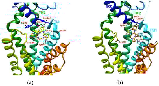 The case of quercetin (MW: 302.24 g/mol) docking with GLP-1R showed that its predicted configuration appeared between Lys202 and Tyr148 and formed hydrogen bonds with Lys197. However, the binding affinity obtained was only −7.8 kcal/mole due to the small size of the molecule. According to an early study by C Koole et al., it was found that quercetin selectively modulates calcium (Ca2+) signaling in the presence of truncated GLP-1 but has no effect on cAMP accumulation [52]. The MW of HJ (487.5 g/mol) in Table 1 was close to that of LSN3160440 (480.43 g/mol). The position of HJ when docking was almost the same as the position of DdC. Compared with PA (which has a sequence similar to HJ), the position of HJ seemed to be more conducive to increasing binding affinity. The docking configurations of quercetin, HJ, and DdC showed that the interval between Lys202, Tyr148, and Lys197 was one of the stable positions where some molecules may tend to appear in GLP-1R. In this interval, the ligand has the potential to have π–π interactions with Tyr145, Tyr148, and Trp33 and form hydrogen bonds with Tyr205, Lys197, Ser31, etc. DdC made a good demonstration, showing most of the advantages in this interval.