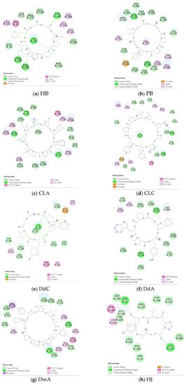 From the 3D renderings shown in Figure 1, it was found that Tyr205, Lys197, and Arg190 on the TM2 axis can be used as reference coordinates to observe the relative relationship between the docking result and GLP-1R. The main structures (predicted or crystallized) of DdC, TT-OAD2, LY3502970, PF-06882961, and HB were distributed in the area above Lys197 (from the positive perspective of the axis). Compared with the predicted result of DdC, the configuration of HB was shifted to ECL2. In addition to the interaction with Tyr148, Lys197, and Trp33, it also had hydrogen bonds with Asn300 and Thr298. Larger cyclopeptide molecules, such as CLC and DmA, had a configuration that surrounded Lys197 in the center and interacted with Arg310TM5 on the periphery. The docking position of PB was in the area below Lys197, which interacted with Gln234TM3, Arg190TM2, Tyr152TM1, and Glu364TM6. HB, PB, CLC, DmA, and DdC were the more distinctive or abundant components in these plants. The docking results showed that their molecules can be distributed in the transmembrane cavity of GLP-1 in a position suitable for their conditions, and establish hydrogen bonds or π–π interactions with the surroundings. The possibility of their interaction with GLP-1R may constitute one of the reasons why these natural products have hypoglycemic effects. The layout of PB in GLP-1R is a particular case. Since there was a relatively large space above Lys197, most of the cyclopeptides and LY3502970 appeared in this area. It was previously reported that PF-06882961 had been observed to promote the recruitment of β-arrestin at a physiological level due to its relationship with TM7. According to the analysis conducted using DS Visualizer, none of these series of plant cyclic peptides had hydrogen bonds with the amino acid residues of TM7, but they may have hydrophobic effects. The location of PB allowed it to interact with low-position residues, such as Tyr152TM1 or Glu364TM6. Tyr152 and Glu364 were adjacent to the TM7 axis; thus, the configuration of PB was more relevant to TM7 in these cyclopeptides.