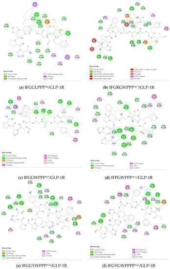 “Receptor–ligand interaction” of IFGGLPPP-derived peptides with GLP-1R from DS Visualizer. (a) IFGGLPPPN4/GLP-1R; (b) IFGRGWPPPN17/GLP-1R; (c) IFGGWPPPN7/GLP-1R; (d) IFPGWPPPN11/GLP-1R; (e) IFGGYWPPPN20/GLP-1R; (f) IFGYGWPPPPN21/GLP-1R.