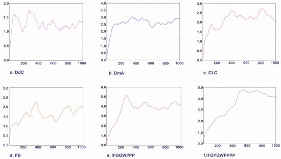 The lowest energy configuration (RMSD = 0) displayed by docking was imported into the UCSF Chimera Molecular Dynamics Simulation, and the structural changes of cyclopeptides and linear peptides in the active region of GLP-1R were further observed over 1000 frames (Figure 14). DdC and PB had lower mean RMSDs relative to DmA and CLC because their configurations were located in a smaller space (Table 4). DmA and CLC had more than 70 atoms whose positions allow for more apparent motion, rotation, and bond twisting; thus, the RMSD is greater than DdC. The average RMSD for cyclic peptides was small, between 1.392 and 2.898 Å. Within this range, the cyclopeptides can maintain the interaction established with GLP-1R at RMSD = 0. This shows that the configuration with the lowest energy (RMSD = 0) obtained by performing ten calculations with AutoDock Vina can be used as a representative of the docking results. Because DdC has conformational changes in small regions, the RMSD plot shows several peaks. During the dynamic simulation of DdC, it was observed that W and Y with longer side chains had a greater effect on the configuration of DdC in GLP-1R (Figure 15). Most of these cyclic peptides can maintain hydrogen bonds with Lys197 and Tyr205 on TM2, but the hydrogen bonds with Gln234 on the outer TM3 may be lost in the process of configuration change. The average RMSD of both IFGGWPPP and IFGYGWPPPP exceeded 4.0 Å because the open N- and C-termini of the linear peptide increased the flexibility of the structure. Linear peptides had a greater range of variation in dynamic observations of 1000 frames. The front end of the sequence can be moved from TM1 to TM2, and the tail end can be moved from TM3 to TM2. However, their general location is still above Lys197. Because GLP-1R is a GPCR, the structure has dynamic variability. The RMSD values of these cyclic peptides and linear peptides can be matched with the changes of GPCRs to produce corresponding interactions. The RMSD value in the range of 1.39–4.23 Å can still allow these cyclic peptides and linear peptides to stay in GLP-1R for some time so as not to immediately exit the active region of GLP-1R due to significant structural changes.