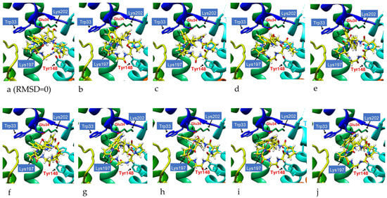 DdC molecular dynamics simulation series with H-bond (red-line) trajectory tracing. Over the course of the dynamic simulation of DdC in GLP-1R, the configuration gradually changes. See images starting from (a) (RMSD = 0), through (b–i) to (j). As the RMSD increases, the original hydrogen bonds are weakened by the increase in bond length.