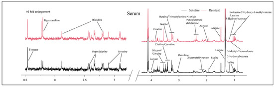 Typical NMR spectra of metabolites between the sensitive and resistant groups are shown in Figure 1. A total of 29 metabolites were identified in the serum, including 2-hydroxybutyrate, isoleucine, 2-hydroxy-3-methylvalerate, leucine, valine, 3-methyl-2-oxovalerate, 3-hydroxybutyrate, lactate, alanine, lysine, acetate, glutamate, pyruvate, pyroglutamate, glutamine, ornithine, choline, carnitine, betaine, trimethylamine-N-oxide, taurine, glycerol, glycine, creatine, tyrosine, histidine, phenylalanine, hypoxanthine and formate.