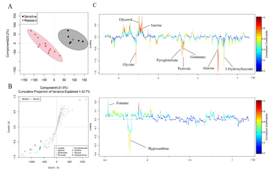 Metabolomics usually uses multivariate statistics to further explore metabolite differences between two groups. The principal component analysis (PCA) score plot showed partial overlap between the two groups (Figure S1). In order to better identify the differences, we used the orthogonal partial least squares discriminant analysis (OPLS-DA) method to perform a comprehensive evaluation. In the OPLS-DA score plot (Figure 2A), the sensitive group was far away from the resistant group, indicating metabolic disturbances between the two groups. S-plots (Figure 2B) and color-coded loading plots (Figure 2C) were used to visualize the contribution of variables between the two groups.